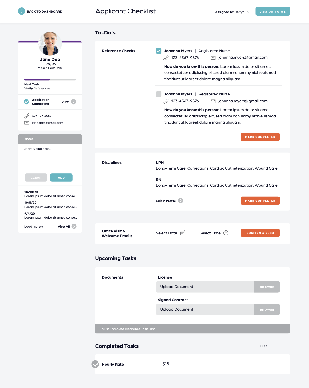 The onboarding workflow guides applicants through a progressive application process - starting with a quick form to capture interest, then deepening into a comprehensive profile as they move through the pipeline. The system automatically generates action item queues for employees ("Finish profile," "Sign documents," "Upload certification") and for recruiters ("Schedule office visit," "Verify references," "Send profile to facility"). Document management is split into required compliance documents that employees must maintain (licenses, certifications) and internal documents that the agency manages (background checks, annual reviews). Integration with testing platforms, digital signature services, and document storage ensures nothing falls through the cracks.